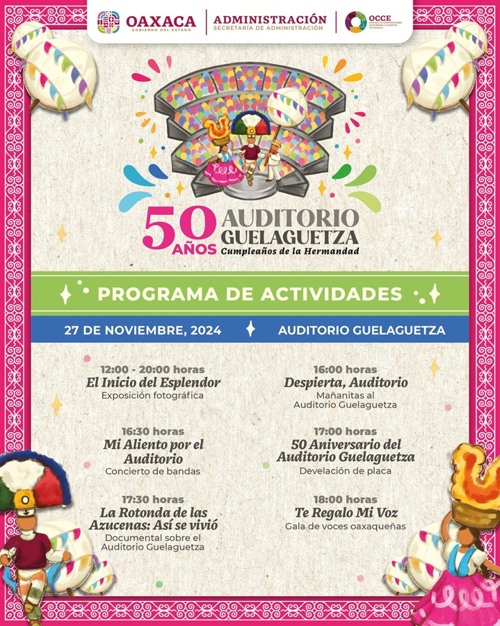 Santa Lucía del Camino, Oax. 26 de noviembre de 2024.- Con diversas actividades artístico-culturales, el Gobierno del Estado celebrará los «50 años del Auditorio Guelaguetza. Cumpleaños de la hermandad», este miércoles 27 de noviembre.