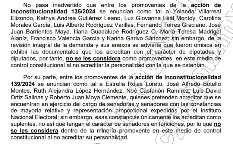 Asimismo, Estrella Rojas, José Alfredo Botello, Ruth Alejandra López, Noé Castañón, Luis David Ortiz Salinas y Roberto Juan Moya, quienes “pretendían acreditar que se encuentran en el ejercicio del cargo de senadores y senadores con constancia de mayoría relativa y representación proporcional expedidas ante el INE únicamente como suplentes, por lo que no se les considera dentro de la minoría promovente en este medio de control constitucional al no acreditar su personalidad”, se lee.