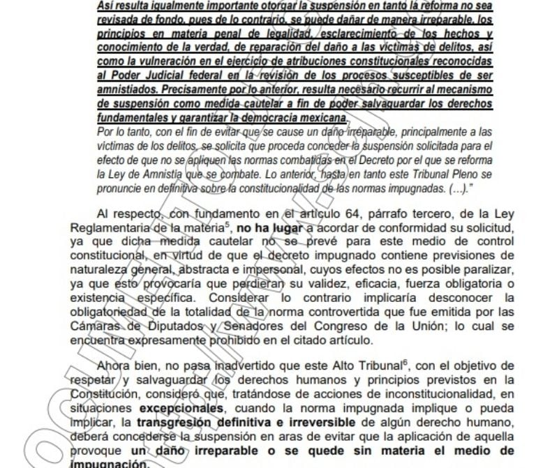 En la argumentación para la acción de inconstitucionalidad, indicaron que el artículo 9 agregado a la Ley puede “dañar de manera irreparable, los principios en materia penal de legalidad, esclarecimiento de los hechos y conocimiento de la verdad, de reparación del daño a las víctimas de delitos, así como la vulneración en el ejercicio de atribuciones constitucionales reconocidas al Poder Judicial federal en la revisión de los procesos susceptibles de ser amnistiados. Precisamente por lo anterior, resulta necesario recurrir al mecanismo de suspensión como medida cautelar a fin de poder salvaguardar los derechos fundamentales y garantizar la democracia mexicana”.